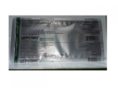 Фармакодинамика: Церулин® - противорвотное средство, способствует уменьшению тошноты, икоты; стимулирует перистальтику желудочно-кишечного тракта. Противорвотное действие обусловлено блокадой допаминовых и серотониновых рецепторов и повышением порога хеморецепторов триггерной зоны. Способствует ускорению опорожнения желудка путем предотвращения расслабления тела желудка и повышения активности антрального отдела желудка и верхних отделов тонкой кишки. Уменьшает рефлюкс содержимого в пищевод за счет увеличения давления сфинктера пищевода в состоянии покоя и повышает клиренс кислоты из пищевода благодаря увеличению амплитуды его перистальтических сокращений. Церулин® стимулирует секрецию пролактина и вызывает транзиторное повышение уровня циркулирующего альдостерона, что может сопровождаться кратковременной задержкой жидкости.