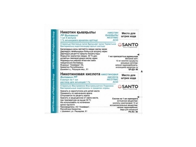 Фармакокинетика: Никотиновая кислота быстро всасывается при парентеральном введении. Равномерно распределяется по органам и тканям. Инактивируется, главным образом, путем метилирования и меньше путем конъюгирования. Частично биотрансформируется в печени с образованием N-метилникотинамида, метилпиридонкарбоксамидов, глюкуронида и комплекса с глицином. Период полувыведения (Т1/2)-45 минут. Выводится из организма почками в неизмененной форме и в виде метаболитов. Почечный клиренс зависит от концентрации никотиновой кислоты в плазме крови и может снижаться при высокой концентрации ее в плазме.