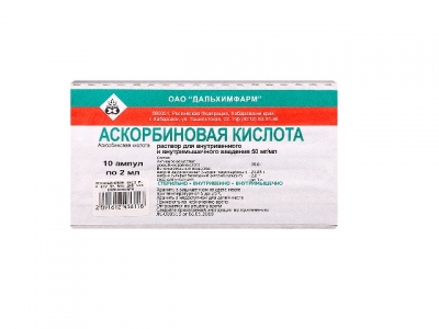 Аскорбиновая кислота 50 мг.Вспомогательные вещества: натрия гидрокарбонат (натрий двууглекислый), натрия сульфит (натрий сернистокислый) 2 мг, вода для инъекций, насыщенная углерода диоксидом до 1 мл.