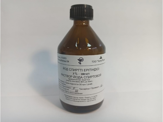Раствор для наружного применения спиртовой 3% прозрачный, красно-бурого цвета, с характерным запахом.