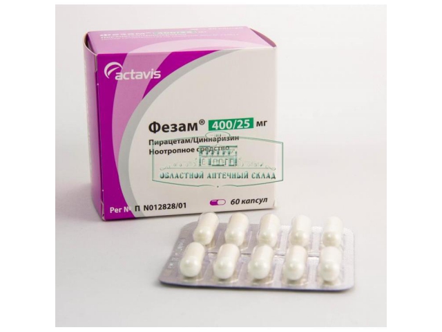 АТХ:Другие психостимуляторы и ноотропные препараты. ТФР:Лекарственные средства. Нозологическая классификация (МКБ-10):F09 Органическое или симптоматическое психическое расстройство неуточненное. F79 Умственная отсталость неуточненная. G43 Мигрень. G93.4 Энцефалопатия неуточненная. H81.0 Болезнь Меньера. H81.4 Головокружение центрального происхождения. I67.2 Церебральный атеросклероз. I67.9 Цереброваскулярная болезнь неуточненная. I69 Последствия цереброваскулярных болезней. S06 Внутричерепная травма. T75.3 Укачивание при движении. T96 Последствия отравлений лекарственными средствами, медикаментами и биологическими веществами. R41.8.0* Расстройства интеллектуально-мнестические. Состав и форма выпуска:Капсулы — 1 капс. пирацетам — 400 мг циннаризин — 25 мг вспомогательные вещества: лактоза; кремния диоксид коллоидный; магния стеарат оболочка капсулы: титана диоксид; желатин в контурной ячейковой упаковке 10 шт.; в пачке картонной 6 упаковок. Описание лекарственной формы:Капсулы: твердые, цилиндрические, желатиновые капсулы белого цвета, №0. Содержание капсул: кристаллический порошок, от белого до бледно-кремового цвета. Характеристика:Комбинированное ЛС. Фармакологическое действие:Антигипоксическое, сосудорасширяющее, ноотропное. Фармакокинетика:Препарат быстро и полностью всасывается в ЖКТ. C_max пирацетама в плазме создается через 2-6 ч, C_max в ликворе — через 2-8 ч. Биодоступность составляет 100%. С белками плазмы не связывается. Проникает во все органы и ткани, проходит плацентарный барьер. Избирательно накапливается в коре головного мозга, в основном в лобных, теменных и затылочных долях, мозжечке и базальных ганглиях. Не метаболизируется. Через 30 ч более 95% выводится почками. C_max циннаризина в плазме создается через 1-4 ч. С белками плазмы связывается на 91%. Активно и полностью метаболизируется. T_1/2 составляет 4 ч. 1/3 метаболитов выводится с мочой, 2/3 — с фекалиями. Фармакокинетика:Пирацетам активирует метаболические процессы в головном мозге посредством усиления энергетического и белкового обмена, ускорения утилизации глюкозы клетками и повышения их устойчивости к гипоксии; улучшает межнейронную передачу в ЦНС, улучшает регионарный кровоток в ишемизированной зоне. Циннаризин — селективный блокатор медленных кальциевых каналов, ингибирует поступление в клетки ионов кальция и уменьшает их содержание в депо плазмолеммы, снижает тонус гладкой мускулатуры артериол, уменьшает их реакцию на биогенные сосудосуживающие вещества (эпинефрин, норэпинефрин, допамин, ангиотензин, вазопрессин). Обладает сосудорасширяющим эффектом (особенно в отношении сосудов головного мозга), усиливая антигипоксическое действие пирацетама и не оказывая существенного влияния на АД. Проявляет умеренную антигистаминную активность, уменьшает возбудимость вестибулярного аппарата, понижает тонус симпатической нервной системы. Повышает эластичность мембран эритроцитов, их способность к деформации, снижает вязкость крови. Показания:Недостаточность мозгового кровообращения (атеросклероз сосудов мозга, восстановительный период ишемического и геморрагического инсультов, черепно-мозговых травм, энцефалопатии различного генеза). Интоксикации. Другие заболевания ЦНС, сопровождающиеся снижением интеллектуально-мнестических функций (нарушения памяти, внимания, на